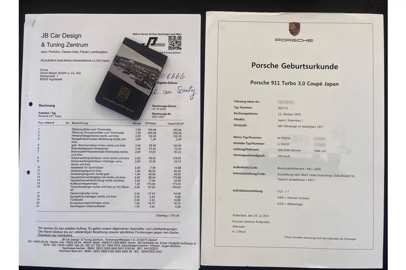 | Nadstandardní výbava: | Tento kousek je ranou sérií slavného Turba 930 dodaného prvnímu majiteli 12. září 1975, což dokládá i certifikát původu. Motor je stále původní a celé auto se těší exemplárnímu vizuálnímu i technickému stavu. Před pár měsíci byl proveden servis za více jak €10 000. Faktury samozřejmě k vozu. Více informací i fotografií rádi zašleme na Váš email. | |