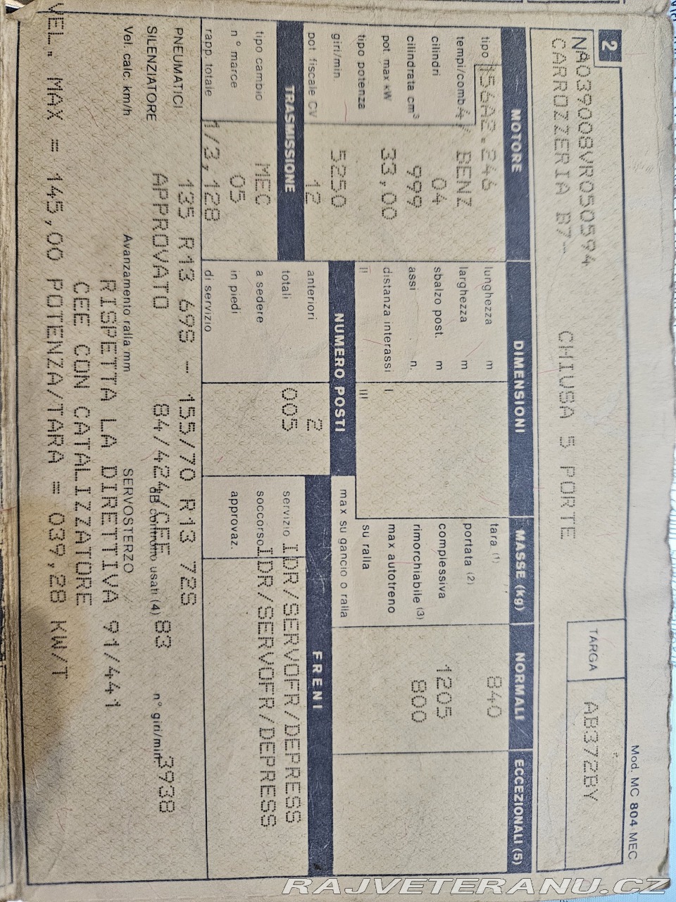 | Doplňující popis: | Prodám Fiat Uno 1.0 Fire Motor benzin 33 kW (45 PS), obsah motoru 999 cm3 Do provozu 4/1994 - možno přihlásit na veteránské i klasické značky! Najeto 66.742 km VIN : ZFA14600009292795 1. majitelka nar. 1929! Dovezeno z Itálie, v Čechách nejeté, orig. italské doklady na přihlášení - možno jak na veteránské, tak na klasické bílé značky Absolutně bez koroze, provozováno ve Veroně kde nikdy nesněží a nesolí se... Auto bylo do roku 2020 v provozu, posledních několik let minimálně, majitelce bylo 95 let... Výměna rozvodů v 66.708 km Interiér v top stavu, bez známek opotřebení Karoserie bez koroze Motor + převodovka ve velmi dobrém stavu. Nová baterie K vidění v Mariánských Lázních Transport možný naší odtahovkou VIN: ZFA14600009292795 | |