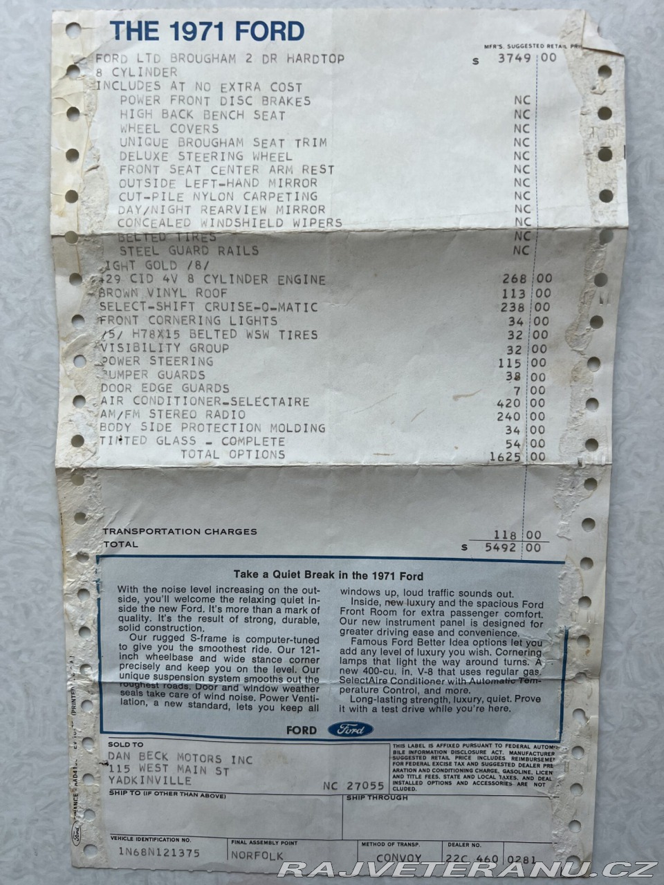 | Nadstandardní výbava: | K prodeji v rámci individuálního dovozu nabízíme brutální kupé v elegantním kabátu. Tento Ford LTD z roku 1971 je ve fantastickém původním stavu, bez koroze a plně funkční. Na voze funguje vše, dokonce i palubní hodiny a klimatizace fouká krásně studený vzduch! Ford byl z výroby objednán u dealerství Dan Beck v Severní Karolíně, kde byl i po většinu života servisován. Až do roku 2022 kdy vůz dorazil do Evropy měl pouze dva majitele. První majitel objednal vůz v jedinečné specifikaci.. krásný světlý lak s hnědou střechou a interiérem v krémové kůži dodávají Fordu elegantní vzhled. Pod kapotou se však ukrývá příplatkový osmiválec Thuder-Jet o objemu 429 cui, tedy 7 litrů s výkonem 360 koní! A to dělá z tohoto LTD jedinečného sleepera, kterému rozhodně nechybí brutální výkon! | |