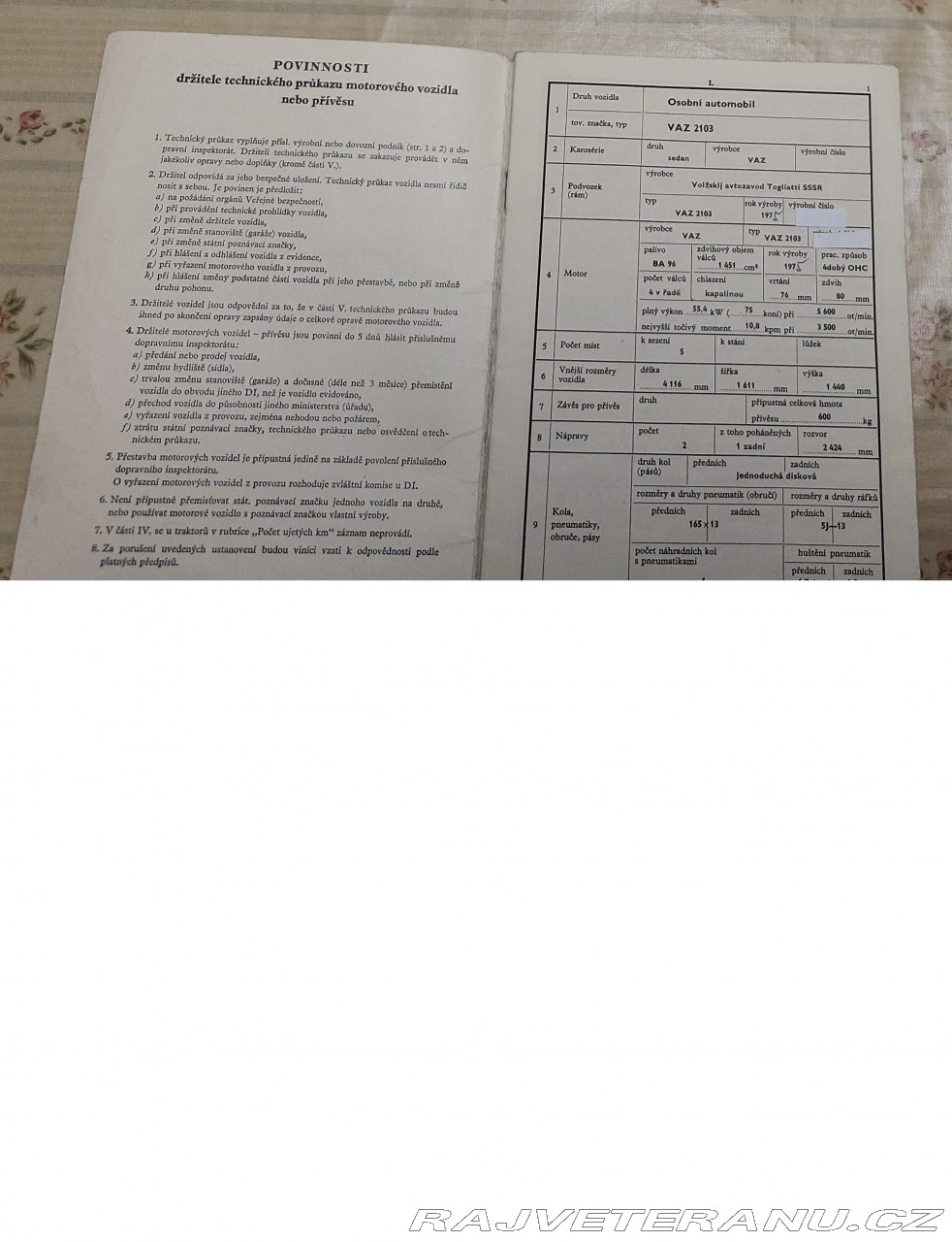 | Doplňující popis: | Prodám Lada Vaz Žiguli 2103 - 1451(1500) rv.1975 - první majitel,najeto 75640km.Velmi dobý stav jak interiéru tak exteriéru.Auto skoro bez koroze,garážované v zimě nikdy nejeto.Na značkách v plně pojízdném stavu.Auto má propadlou TK-(není problém udělat/obnovit)K vozu je i původní kupní smlouva - jasná historie původu vozu.Auto nikdy nebouráno. | |