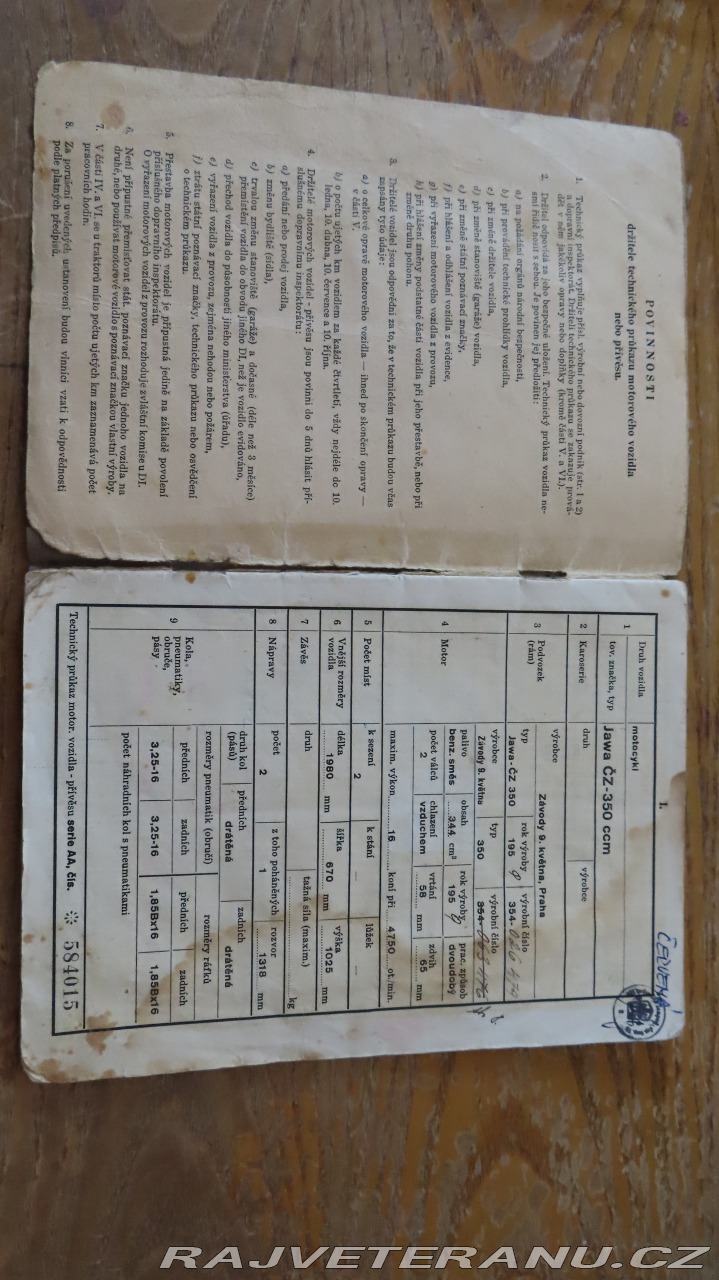 | Doplňující popis: | r.v. 1959, nová STK, psaná na mne, originál papírové TP, kompletní, jezdí svítí troubí, skvěle brzdí. K motorce jsou všechny originál revmaplechy včetně původních blinkrů a krytu řětězu. Zapalování VAPE - není třeba baterie. Trilobit i tachometr fungují. Vyměněný olej a filtr, nová lanka. Krásné sedlo. Plexi prasklé ale funkční. https://rajce.net/tuzemak100/album/350-354 | |