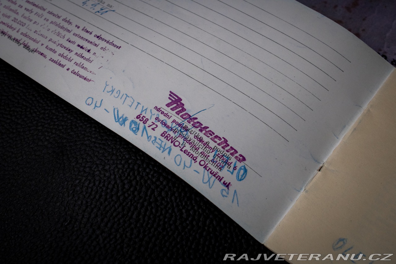 | Nadstandardní výbava: | Zakúpené v Mototechna Brno v roku 1975. Plná dokumentácia. | |
