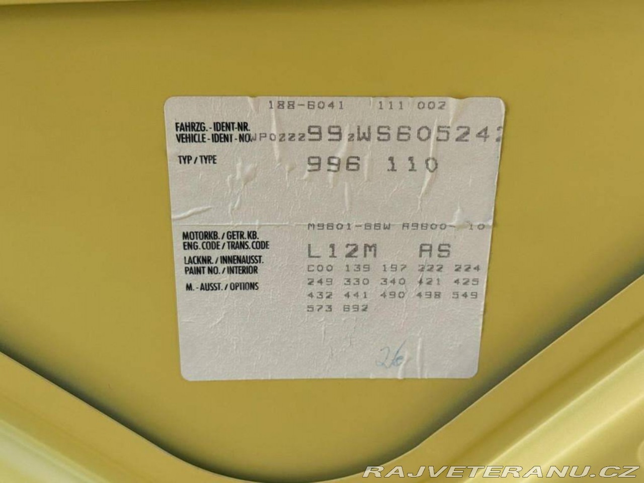 | Doplňující popis: | Porsche 911 (996) Carrera ve verzi 3.4 Coupé s úpravou GT3 Aero, který zaujme nejen svým vzhledem, ale i jízdními vlastnostmi. Tento konkrétní kus z roku 1998 je lakovaný ve vzácné žluté barvě, která podtrhuje jeho sportovní charakter a originalitu. Vůz má najeto 87 595 km a je poháněn benzínovým šestiválcem o objemu 3,4 litru s výkonem 301 koní, spojeným s automatickou převodovkou. Auto je ve velmi dobrém technickém i vizuálním stavu, odpovídajícím jeho stáří, přičemž motor je ve výborné kondici a jízda je plynulá a bezproblémová. Interiér je čalouněný černou kůží, která působí zachovale a elegantně, a nabízí komfortní prvky jako vyhřívaná sedadla, automatickou klimatizaci či palubní počítač. Vůz je vybaven sportovním paketem zahrnujícím snížený podvozek, 18" litá kola a systémy pro lepší trakci a stabilitu. Nechybí ani bezpečnostní výbava jako ABS, airbagy, tempomat nebo alarm. Velkou výhodou je kompletní servisní historie doložená servisní knížkou, fakturami i protokoly z kontrol. Vůz je nehavarovaný a k dispozici jsou dva klíče s dálkovým ovládáním. Vůz je inzerován formou zakázkového dovozu ze zahraničí. Cena zahrnuje prověření a prohlídku vozu i jeho dopravu do ČR. Veteráni na Truc: parta normálních lidí, kteří milují auta. Desítky aut máme skladem v naší péči a další připravené k dovozu. Rozumíme vašim potřebám, jsme k dispozici pro vaší plnou spokojenost, protože ta je naším cílem. Umíme toho víc – například veškeré dokumenty nutné pro přihlášení vyřídíme rychle a efektivně. Více informací ochotně poskytneme na telefonním čísle +420723510286 (i Whatsapp). Umíme vyřešit dovoz vašeho vysněného auta odkudkoliv (ať už klasického nebo nového) včetně registrace, pojištění a dalších souvisejících služeb. | |